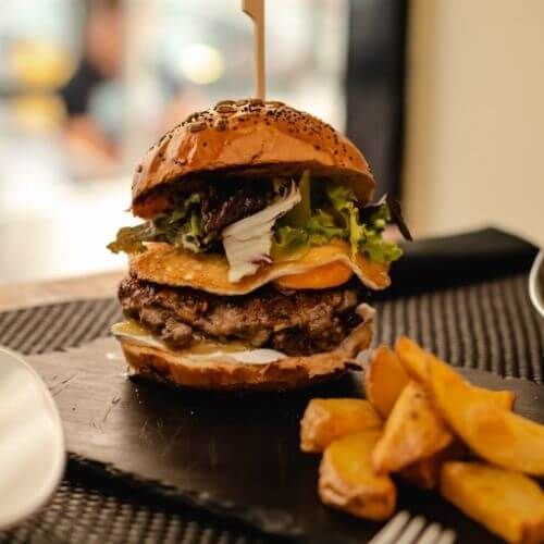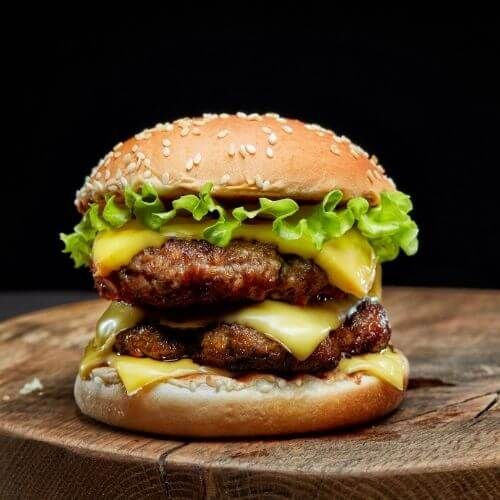Με διπλό μπιφτέκι, πατάτες, κρεμμύδι, σως, μαρούλι, ντομάτα, πίκλες